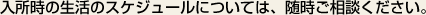入所後の生活は、ご利用者様の状況や状態、今までの生活リズムに合わせたスケジュールで生活する事ができます。ぜひ、小さいことでもすぐ、スタッフにご相談ください。